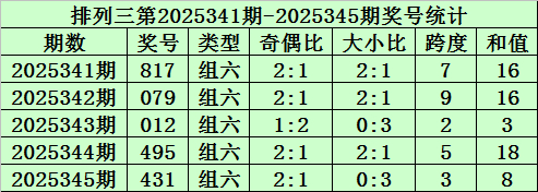 上期回顾:排列三第2025345期开奖号码为431。奖号类型为组六,奇偶比为2:1,大小比为0:3,跨度为3,和值为8。