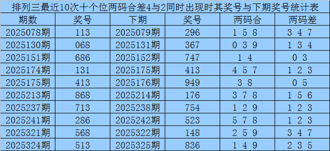 十个位合差分析:上期奖号十个位开出31组合,两码合为4,两码差为2,最近10次十个位两码合4与两码差2同时出现时,其奖号和下期奖号分别为: