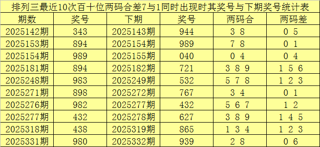 百十位合差分析:上期奖号百十位开出43组合,两码合为7,两码差为1,最近10次百十位两码合7与两码差1同时出现时,其奖号和下期奖号分别为: