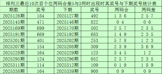 从以上统计可以看出,百个位两码合差5与3同时出现之后其下期两码合差表现最热的4个分别为:2359,本期百个位两码合差可以参考这四码中的数据。