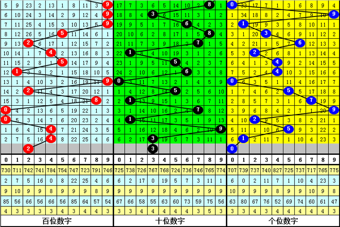 从以上统计可以看出,百十位两码合差7与1同时出现之后其下期两码合差表现最热的4个分别为:0134,本期百十位两码合差可以参考这四码中的数据。