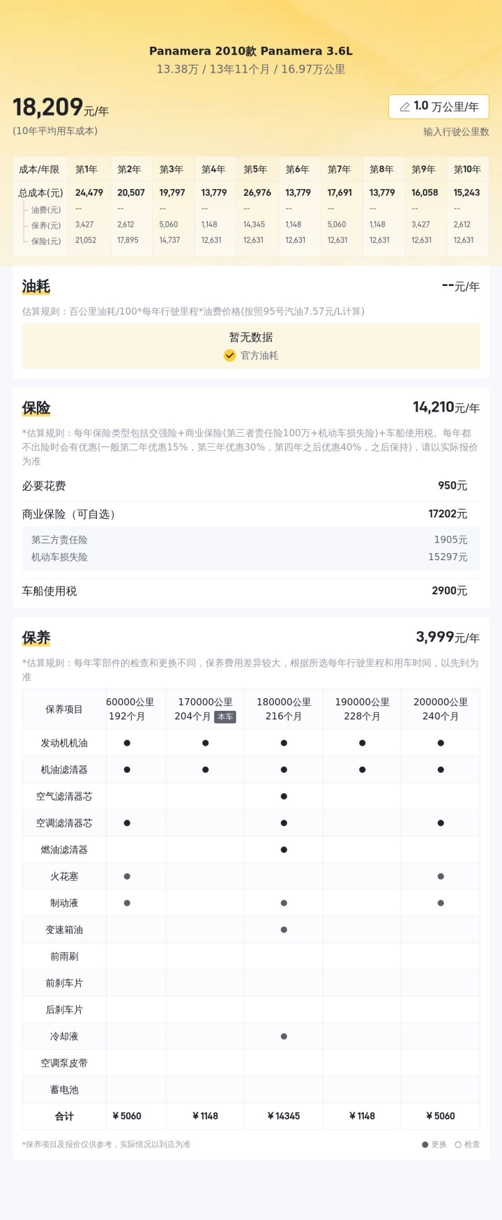 根据当前市场行情,这辆二手Panamera的售价区间应为10.78万元至14.12万元。考虑到车辆的保养记录良好且为热门车型,这一价格较为合理。在用车成本方面,预计每年的花费约为2.6万元,这包括了保险、保养和燃油等费用。对于一款豪华跑车而言,这样的成本支出仍在可接受范围内。