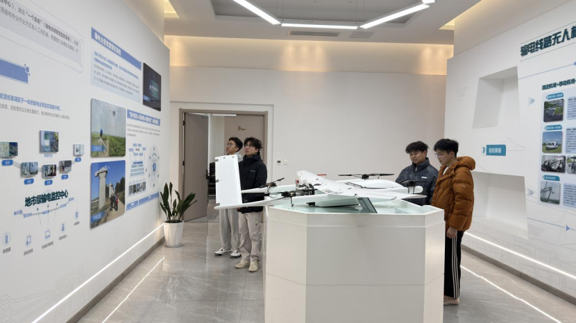 移步至公司的数智化展示中心,实践团深入参观了“配网不停电作业机器人”作业演示区。机器人通过高精度视觉识别与机械臂协同,模拟完成了带电接引线的全流程作业,全过程无需人员直接接触带电部位,生动体现了配网运维向自动化、智能化发展的趋势。在与之相邻的“输电线路实操”板块,展厅通过展示线路杆塔实物模型、绝缘子串样品、接地装置展示,并结合三维动态演示与模拟操作系统,系统呈现了输电线路从规划设计、施工建设到智能巡检与故障处理的完整技术链条。重点展示的无人机自主巡检、通道可视化监控、在线监测诊断等数字化技术,清晰揭示了输电领域正从传统人工巡线向“空天地”一体化智能运检模式的深刻转型。